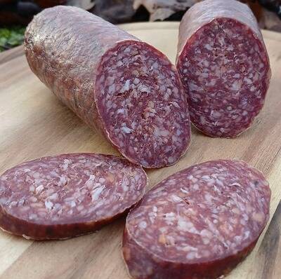 Rindfleisch vom Highland Cattle, Bickelbacher Steinsalz, schwarzer & weisser Pfeffer gebrochen, Senf, Paprika (scharf), Knoblauch, Koriander, Dextose, Maltodextrin,